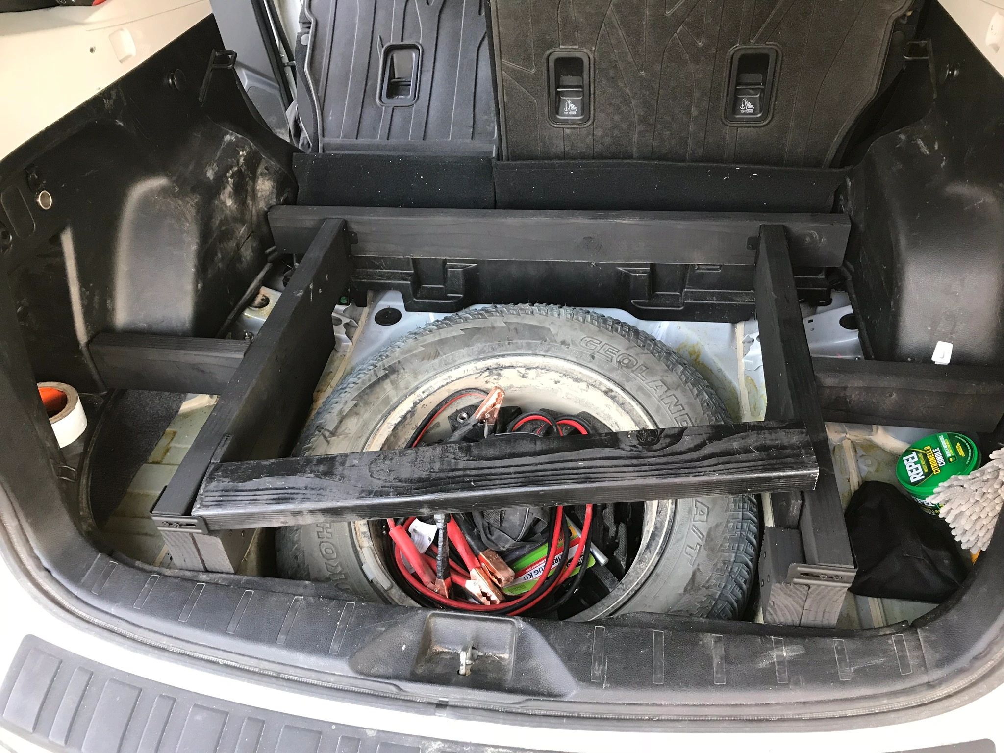 Finding a place to mount a full size spare can be a little challenging. In my old 2015 Subaru Forester XT, I built a wooden frame to raise the cargo floor (pictured). This allowed a full size spare to fit. A popular option is to place a full size spare on top of a cargo basket but the only problem is it will greatly increase wind drag and will drop MPG's, we are talking anywhere between 4-9 MPG. You can always carry one in your trunk area, place one in a roof cargo carrier, or purchase a rear hitch tire carrier. JUST, DON'T LEAVE HOME WITHOUT A FULL SIZE SPARE.