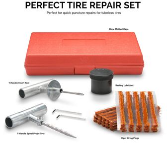 Comes with 4 6 plugs Contains: Pistol grip reamer, Pistol grip plugger, 8 tire repair strings, and 12ml rubber cement tube.